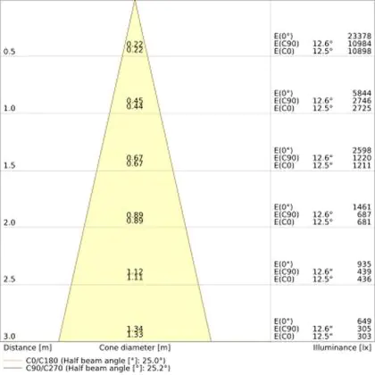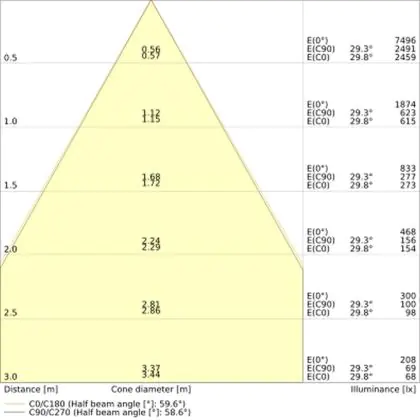 Der Abstrahlwinkel bezeichnet den Winkel, in dem das Licht aus der Lichtquelle ausgestrahlt wird. Er wird in Grad (D) angegeben. Je geringer die Gradzahl des Abstrahlwinkels ist, desto kleiner ist auch der Durchmesser des Lichtkegels, den die Lichtquelle produziert. Beispiel: Wird eine Lampe mit einem Abstrahlwinkel von 60 Grad an der Decke (2,5 m Höhe) angebracht, erzeugt sie einen Lichtkegel von 2,9 Metern Durchmesser. Hat die Lampe hingegen einen Abstrahlwinkel von 120 Grad, beträgt der Lichtkegel 8,7 Meter im Durchmesser. |