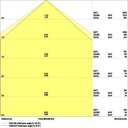Der Abstrahlwinkel bezeichnet den Winkel, in dem das Licht aus der Lichtquelle ausgestrahlt wird. Er wird in Grad (D) angegeben. Je geringer die Gradzahl des Abstrahlwinkels ist, desto kleiner ist auch der Durchmesser des Lichtkegels, den die Lichtquelle produziert. Beispiel: Wird eine Lampe mit einem Abstrahlwinkel von 60 Grad an der Decke (2,5 m Höhe) angebracht, erzeugt sie einen Lichtkegel von 2,9 Metern Durchmesser. Hat die Lampe hingegen einen Abstrahlwinkel von 120 Grad, beträgt der Lichtkegel 8,7 Meter im Durchmesser. |