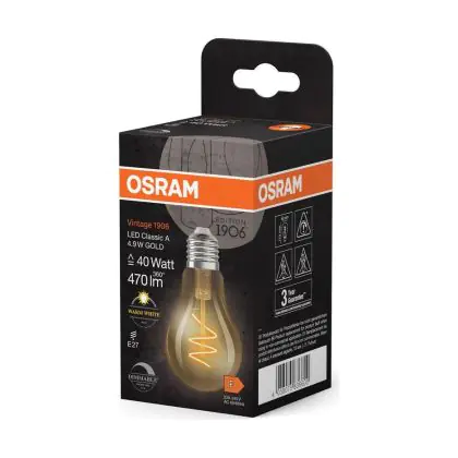 Cette ampoule Osram Vintage 1906 LED Classic E27 Poire Filament Dorée 4.9W 470lm - 927 | Meilleur Rendu De Couleur - Dimmable - Remplacement 40W est l’alternative idéale pour la remplacement de votre ampoule classique de 40 W. La technologie LED intégrée vous offrira de nombreux avantages. Les ampoules à incandescence traditionnelles ont une durée de vie limitée. Cette alternative LED vous permettra de profiter d’un éclairage durable et fiable.