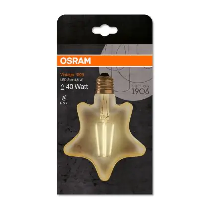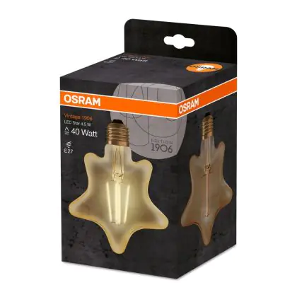 Cette ampoule Osram Vintage 1906 LED E27 Star Filament Dorée 4.5W 470lm - 825 | Remplacement 40W avec son efficacité lumineuse de lumen par watt vous permettra de profiter d’un éclairage de qualité. Avec sa durée de vie de 15000 heures, vous n’aurez pas à vous soucier de son remplacement avant quelques années.