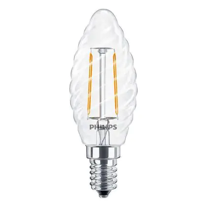 Cette ampoule Philips Corepro LED Bougie E14 Torsadée Bougie Filament Claire 2W 250lm - 827 | Remplacement 25W avec son efficacité lumineuse de lumen par watt vous permettra de profiter d’un éclairage de qualité. Avec sa durée de vie de 15000 heures, vous n’aurez pas à vous soucier de son remplacement avant quelques années.